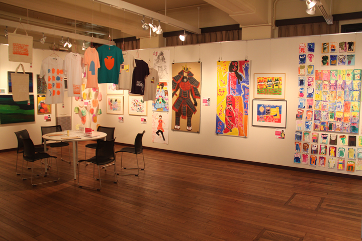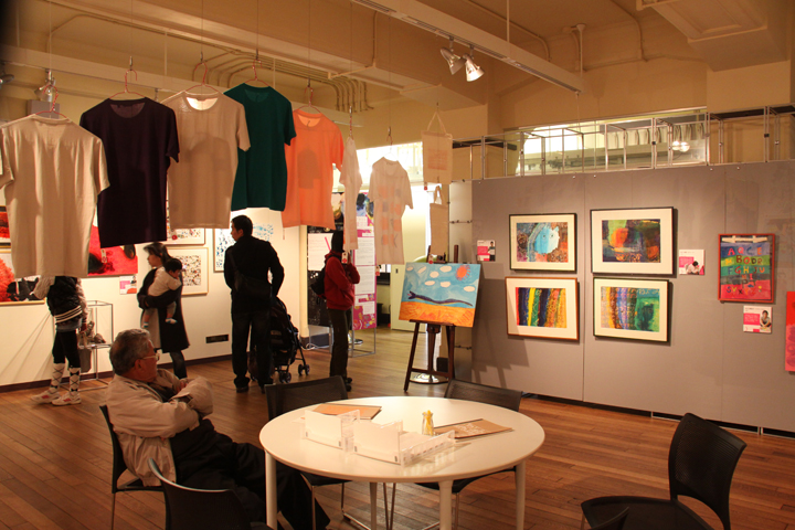同校教員との対話の中でわかったことは、学校における児童・生徒たちの「創作活動」が、彼らに生きる喜びを与えているにもかかわらず、そうした場が、卒業後は確保しづらいという現実である。しかし、彼らの作品を「商品」に転化し、別の価値を付すことで、創作の場を確保するひとつの可能性が出てくることは、前例のないことではない。そこで、本展では、作品のオリジナルの展示にとどまらず、それらを使ったTシャツなどのグッズを製作し、それ自体を展示品とした。同時に、来場者へのアンケートを行い、それらグッズの商品的価値についての調査も行った。