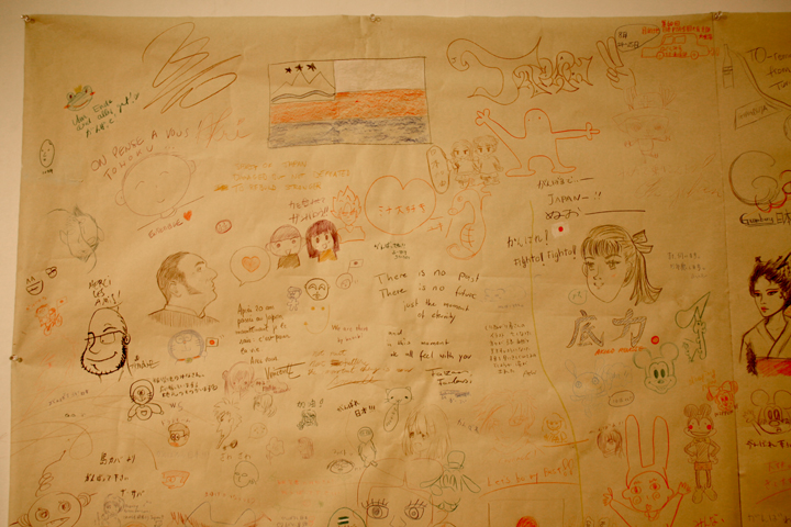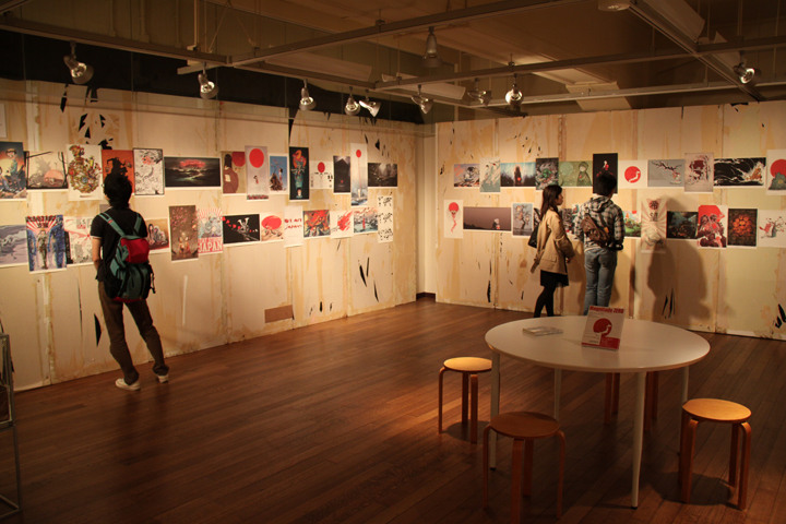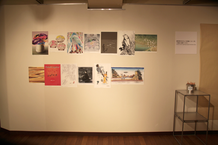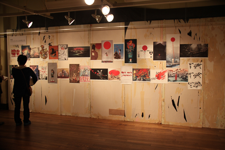 『マグニチュード9』の作品と1年後に集められた作品の印象は、全く異なっている。前者は、震災直後、外国人による作品がほとんどであったため、破壊のイメージが直接的に描かれたり、日の丸や桜といった日本のステレオタイプのイメージが採用されたりしていた。一方後者は、震災から1年後、日本に住む作家が描いたものがほとんどであったためか、3・11を想起させるような直接的表現はなりを潜め、それぞれ異なる思いの“着地点”において描かれているのが印象的であった。そうした両者の違いを際立たせるため、前者は、壁紙を破り、地のベニヤ板をむき出しにした壁に、後者は、白くきれいな壁に展示した。