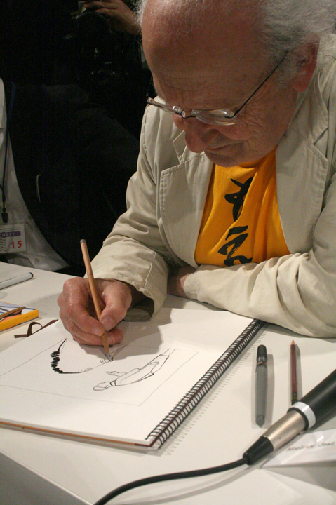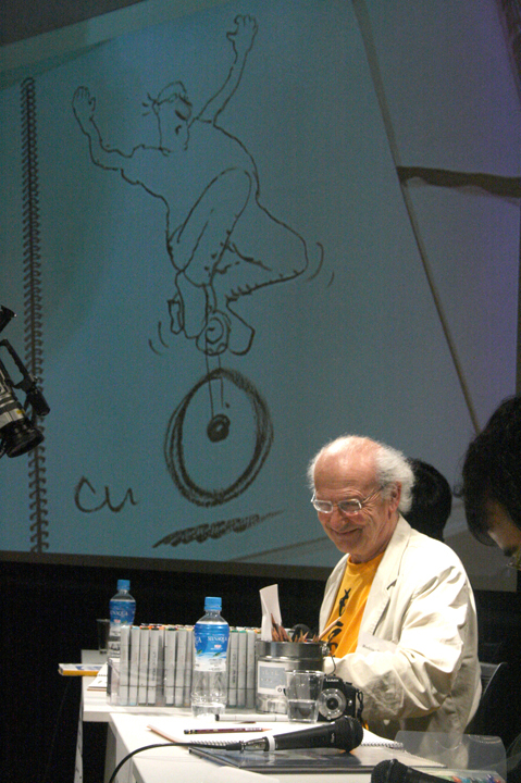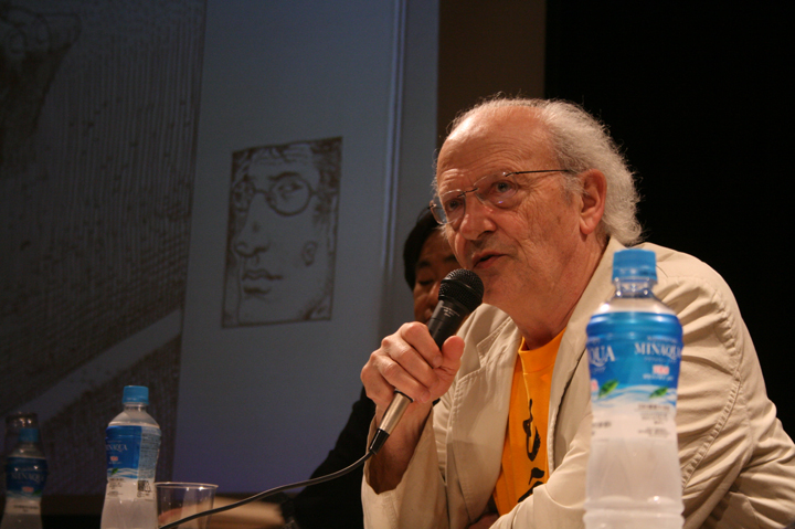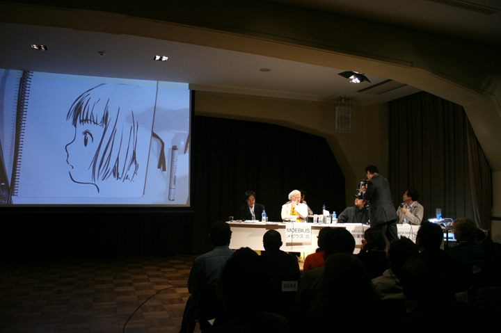 フランスバンド・デシネ(BD)界の世界的巨匠メビウス氏を紹介する企画展「メビウスの世界」の関連イベントとして開催。メビウス氏本人と、同氏も一目置く人気イラストレーター村田蓮爾氏のトークに、両氏の即興ドローイングを組み込んで行われた同イベントは、マンガ界全体においてニュースとなるほどエポックメイキングなものとなった。