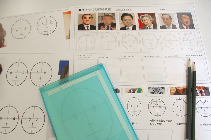 後半は似顔絵作画ワークショップ。描き込み式のワークシートを使い、似顔絵を描くためのポイントと顔の特徴の捉え方を、オガワが実際に作画しながら解説。著名人の写真資料を用いて、目、口、鼻の位置の違いについても解説。髪型や服装など顔以外にもモデルらしさを捉えるポイントがあることを紹介した。最後に各々自画像を描き、講評会を行った。