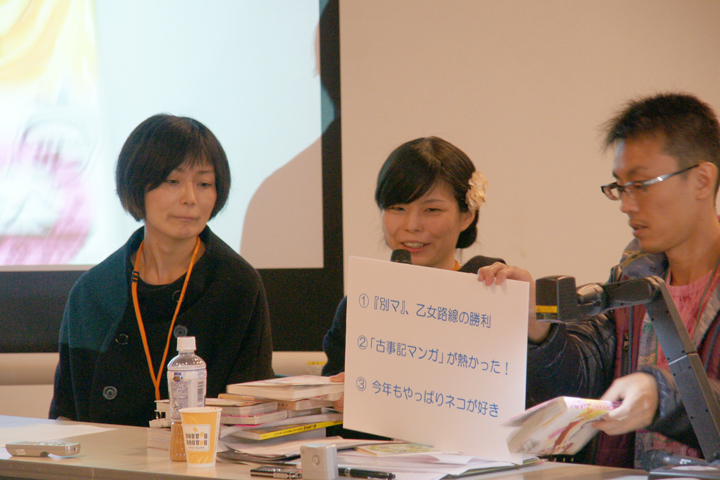 金水は、マンガの映画化・ドラマ化やロンドンにおけるマンガ体験等から、猪俣は、外国人作家に浸透した日本マンガスタイルや日本でのフレンチ・コミックス(BD)ブーム等から、倉持は、「乙女路線」をとった『別冊マーガレット』の躍進や「古事記マンガ」ブームといった視点から、今年気になったマンガ作品を紹介した。また、伊藤は、マンガ展覧会やマンガを活用した地域振興を紹介しつつ近年におけるマンガ文化の社会的評価について論じ、吉村は、パチンコ・パチスロマンガ誌業界の再編成や、今年の物故者の思い出について語った。