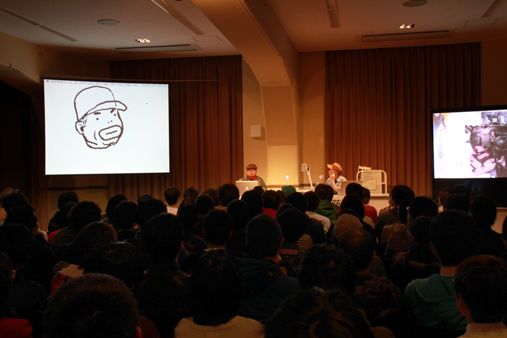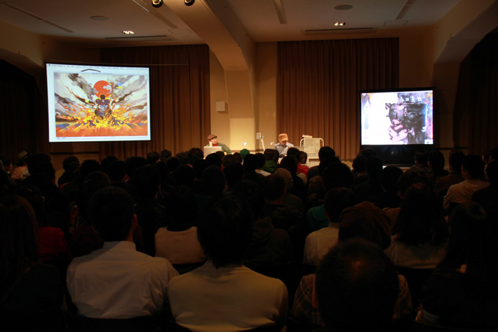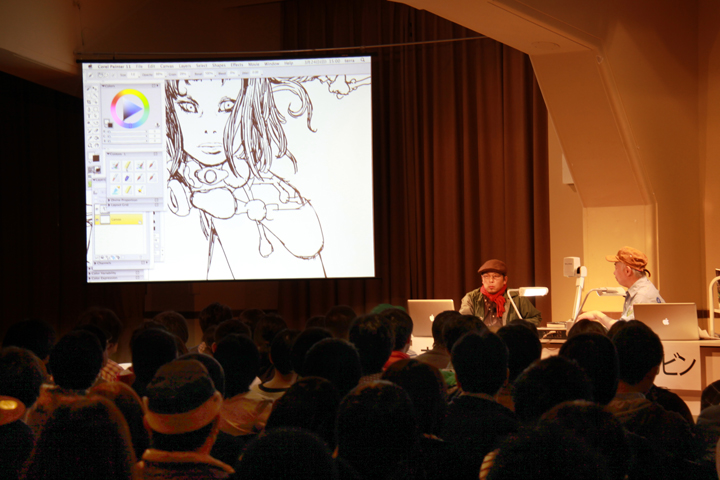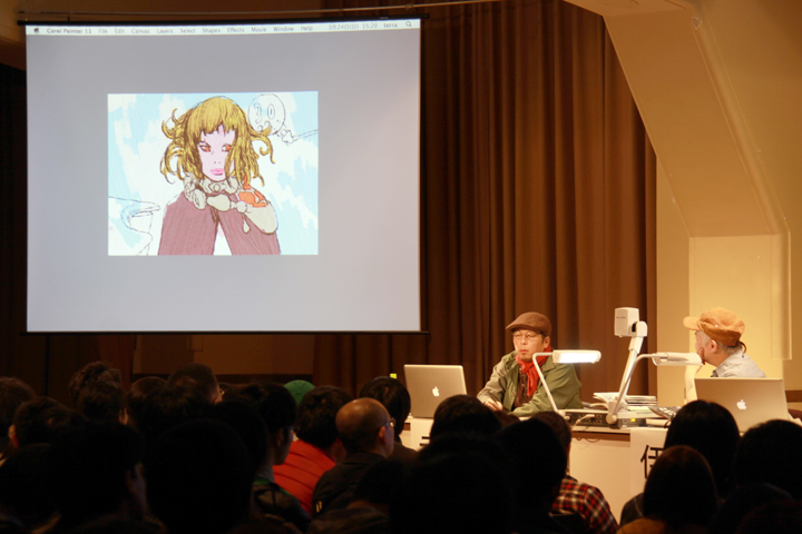 トーク中、プロジェクタにつなげたPCモニタ上では、寺田氏によるペンタブレットを使った即興によるデジタルイラストの製作がライブに進行し、話に説得力を与えた。