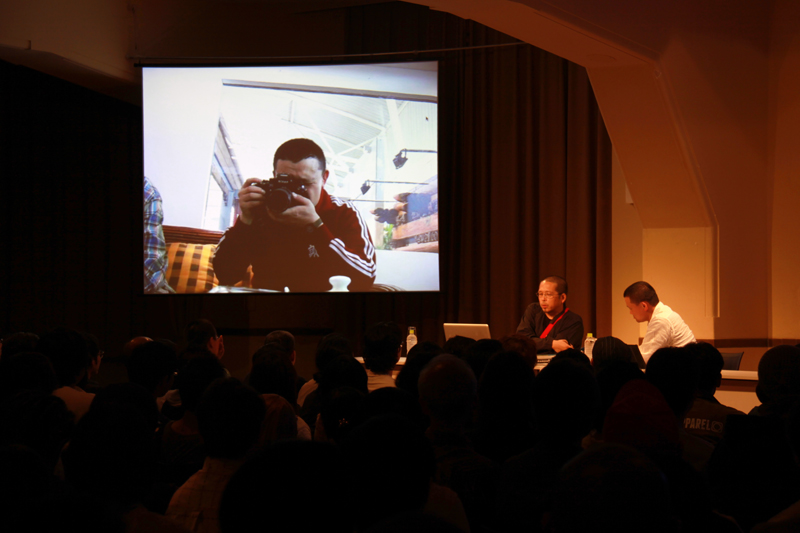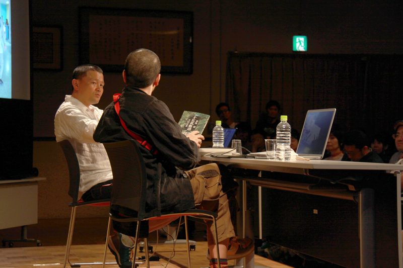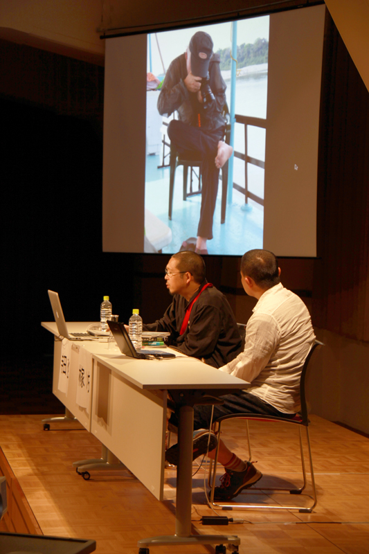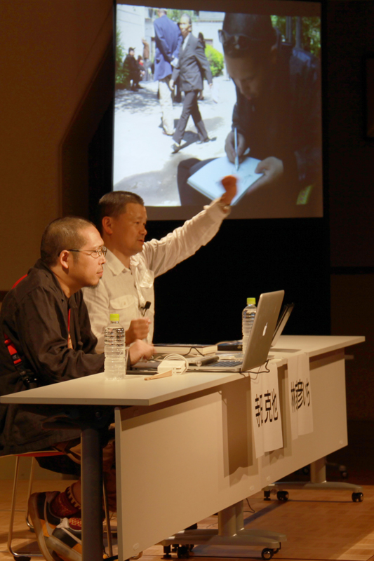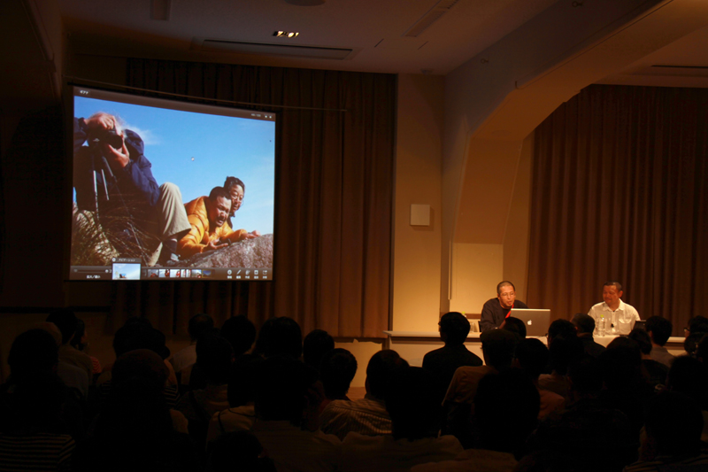 両氏は、シルクロードや南米ベネズエラを共に旅した旅仲間。本イベントは、道中の様子を撮った写真を見せながら、ときに寺田氏のライブドローイングをはさみつつ対談を行った。会場には2台のプロジェクタを配し、両氏が撮った旅の写真を同時に写しだした。旅先の風景、食事、生活、出会った人、トラブルなど道中の様子を軽妙な掛け合いにより披露した。