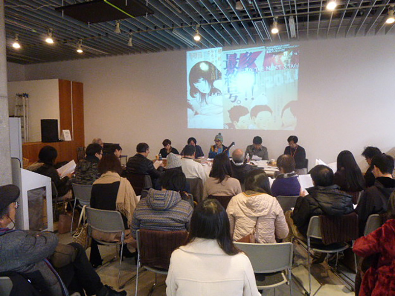 吉村は、自身も関わっているマンガをめぐる国の動きや、同年に亡くなった劇画家・石川フミヤス氏と、氏が関わった「劇画」の誕生について語った。倉持は、「壁ドン」などの少女マンガ発の文化現象について、雑賀は、具体例を紹介しつつ著作権や表現規制をめぐる状況について解説した。金水は、「役割語」研究の新しい展開について、伊藤は、同年に急増したマンガ展の背景について論じた。