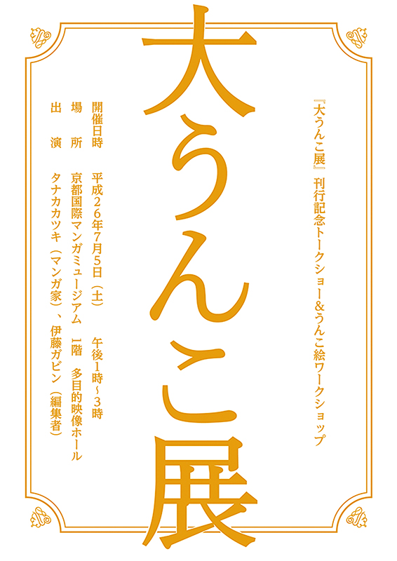 2014年4月に発売された架空の展覧会図録『大うんこ展』は、クリエイターのタナカカツキ氏が描く子どもたちや先生が、編集者の伊藤ガビン氏の手掛ける展覧会を訪れ、様々な「うんこ」の絵を鑑賞するという内容である。両氏は同書の中で、「うんこ」と連呼するだけで大笑いできる小学生の頃の純粋な笑いを追求した。この刊行を記念して、著者のタナカカツキ氏と伊藤ガビン氏から、本書の企画・出版に至るまでの経緯や、裏話などを紹介するトークショーを開催した。なお、トークショーではイベント来場者からうんこ絵を描いてもらい、披露するコーナーも設けられた。