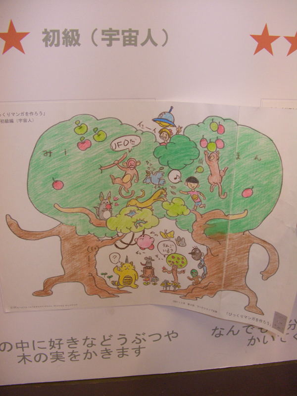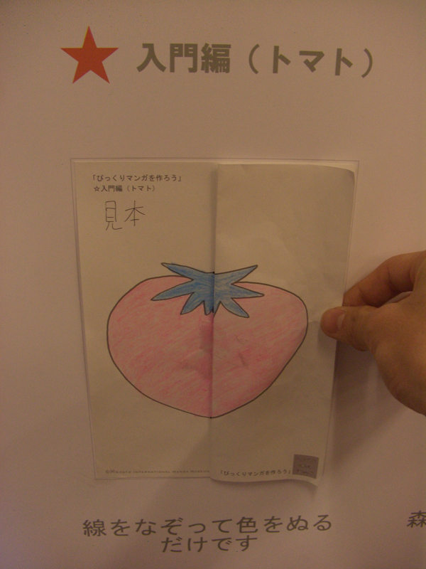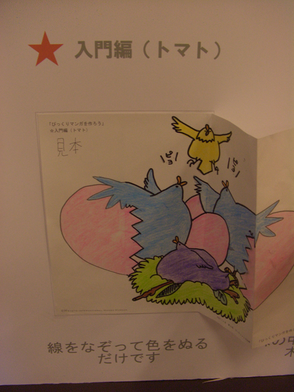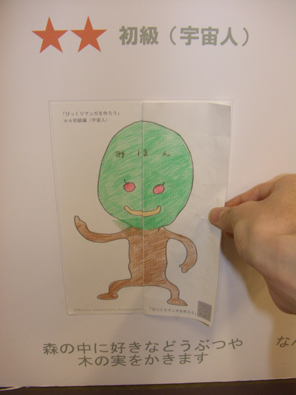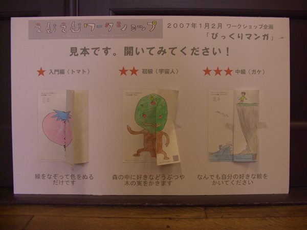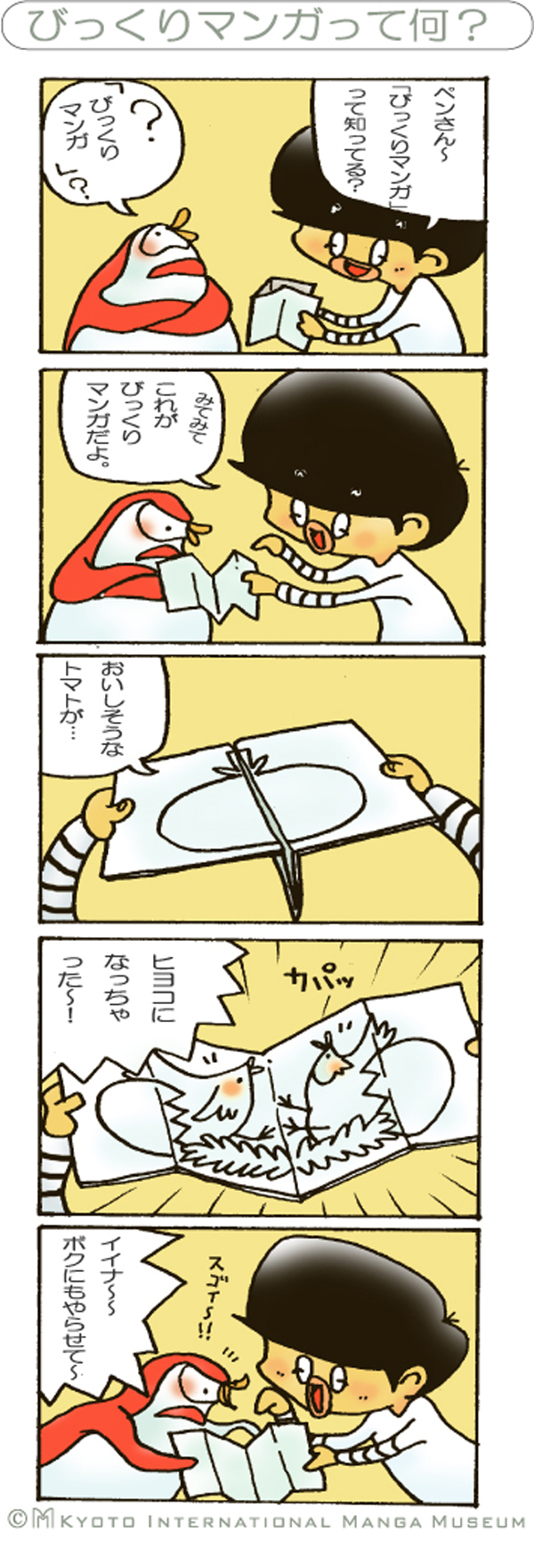 本企画では「めくる」動作をする読者と「オチ」を考える作者の両方が体験できる。2コママンガのように中から絵が飛び出してくる仕掛けがされている専用体験用紙を使用。予め下絵が描かれている入門編・初級編と、自分でオチを考えて描く中級編の3種類を用意。参加者は体験用紙を手にした当初は「読者」だったが、体験するにつれて徐々にのめり込んでいく体験者が現れ、クォリティーの高い作品が完成した。小さな頃から様々なマンガに触れている事で「マンガを見る目」が養われていることがわかるワークショップとなった。