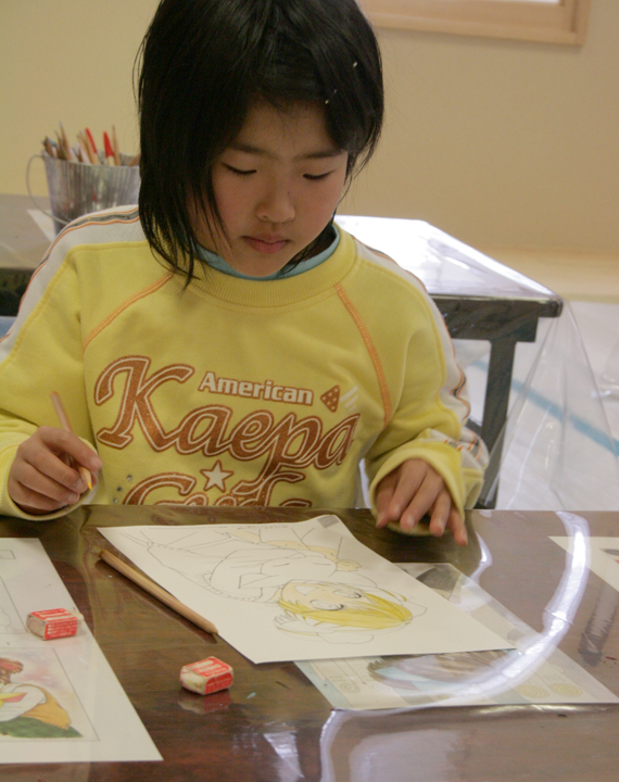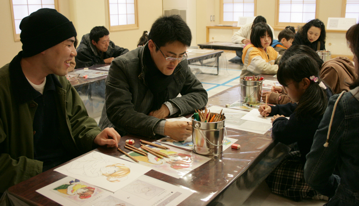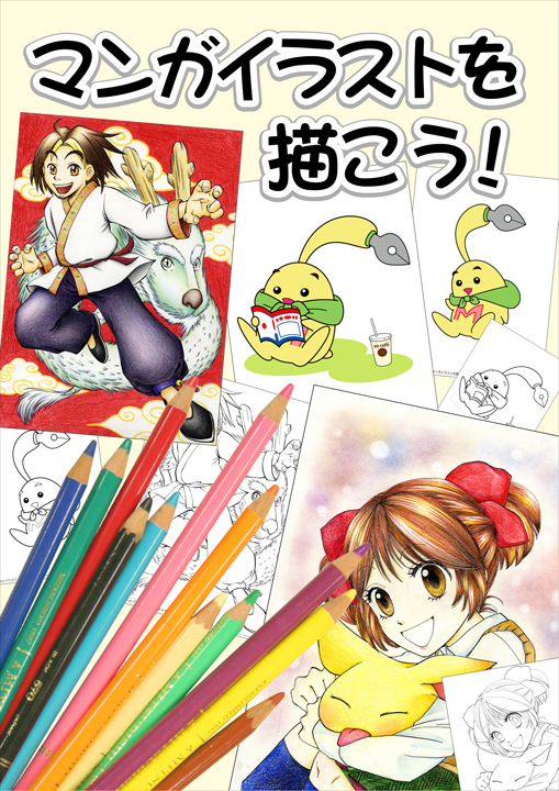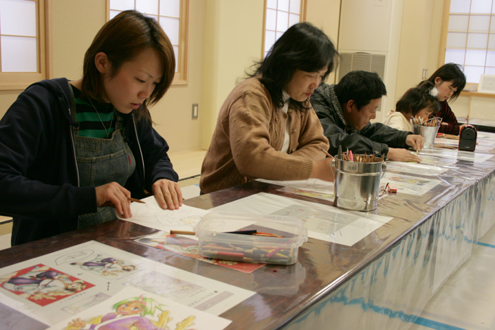 カラーのマンガといえば表紙や扉絵などを思い浮かべるのではないか。読者はまず表紙を見て作品の中身を判断し想像する。表紙は作品の内容を一目で表すとても重要なモノだ。本企画はマンガの表紙をイメージした線画サンプルを準備しそれを参加者に塗ってもらうという内容。ひと言でいうと「ぬりえ」なのだが、ぬりえの持つシンプルさや気軽さに加えてぬり絵の奥深さを感じてもらえるよう工夫した。希望者には、色彩のバランスや影のつけ方など、絵画的指導を行う。参加者は着彩に対するコツや知識など技術を通して「ぬり絵」の魅力を知る機会となった。
