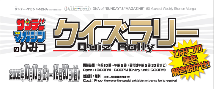 「サンデー マガジンのひみつ クイズラリー」は特別展「サンデー・マガジンDNA」に展示されている人気キャラクターの秘密について、特別展会場内からヒントを得て秘密を解き明かすクイズラリー。クイズに答えながら展覧会を見学することで、少年誌50年の歴史や両誌のDNA的関係性などの理解を深めてもらうことを目的とする。クイズラリー用紙は特別展入場者全員に配布し、順路にあわせた時代別クイズや時代を越えた両誌の繋がり、関係性がわかるクイズなど10問を出題。クイズの内容は初級編と中級編の2パターンを準備した。クイズラリー参加者には参加賞を、全問正解者には展覧会図録や、Tシャツ、両誌のマンガをニンテンドーDSRで読むことができるソフト「DS vision」などが当たる抽選を行った。誰もが知っている両誌だけに限定されたファンのみならず、お子さまからご年配の方まで幅広く参加。両誌の歴史や関係性を提示する良い機会となった。