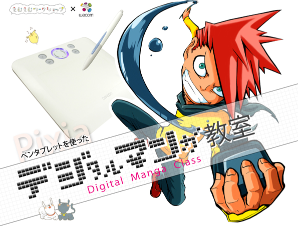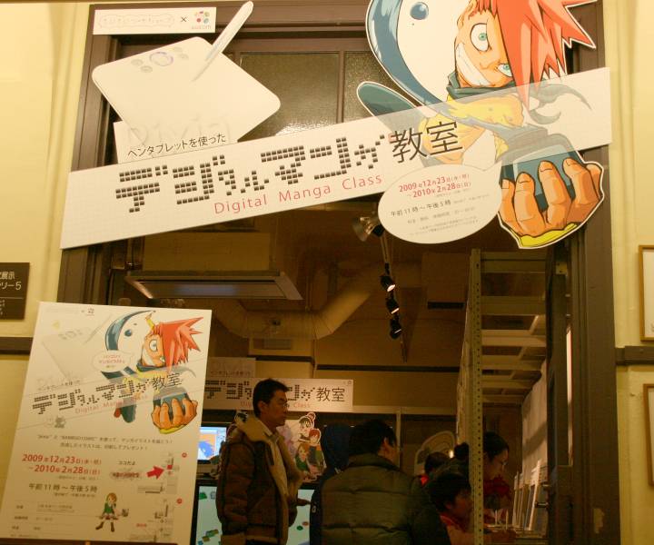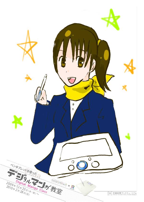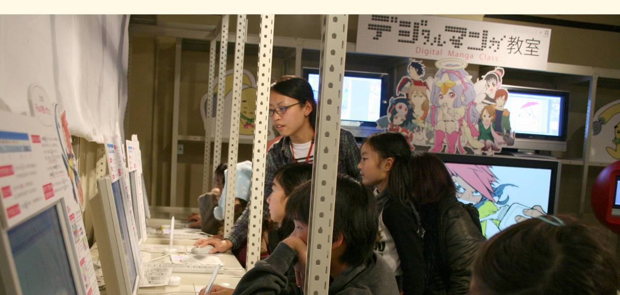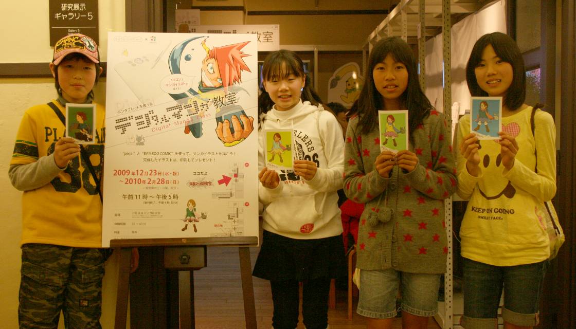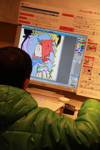 近年インターネットなどコンピュータの普及によりマンガ業界もデジタル化が進み、多くのマンガ家が作画を従来のペンやインクだけに頼らず、パソコンでの作業を取り入れている。本企画はマンガ制作におけるデジタル作画の魅力や楽しさを体感する事を目的とした。作画ソフトはフリーダウンロードソフト「Pixia(ピクシア)」を使用、作画ツールは株式会社wacomのペンタブレット「BAMBOO TM COMIC」を使用した。ペンタブレットとは、パソコン操作をする上でマウスのかわりに、ペンとタブレット(ボード)を使用し、まるでパソコン画面に直接ペンで作画しているような豊かな表現力を楽しむ事ができるキットのことである。マウスに比べ細やかな操作が可能で、線画や着彩などの作業に適している。体験では、16種類のイラスト(線画)と白紙から1つ選択し、自由に作画を楽しむことができる。完成作品はA6用紙にプリントアウトし、記念品としてプレゼントした。マンガ創作においてデジタルツールを用いることへの興味や関心は非常に高く、「デジタル作画」を体験してもらう良い機会となった。