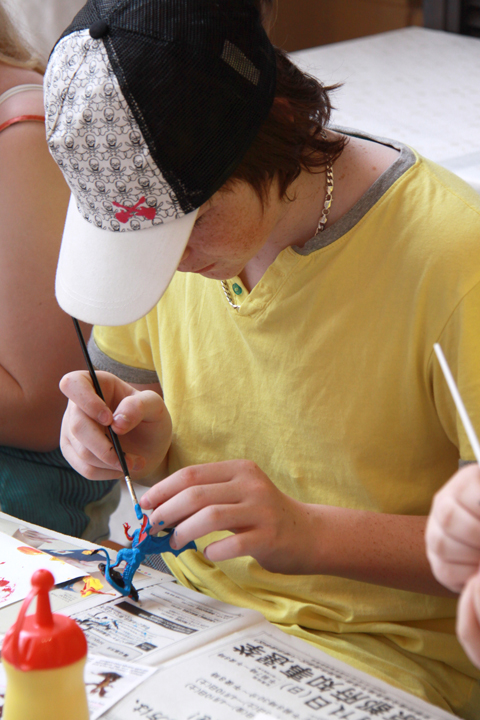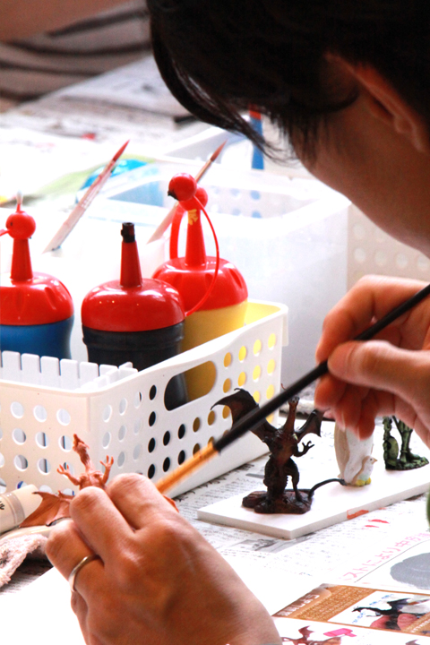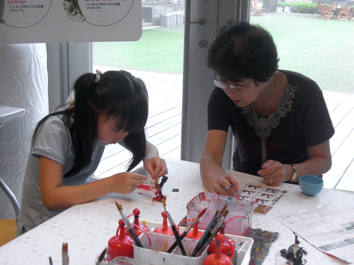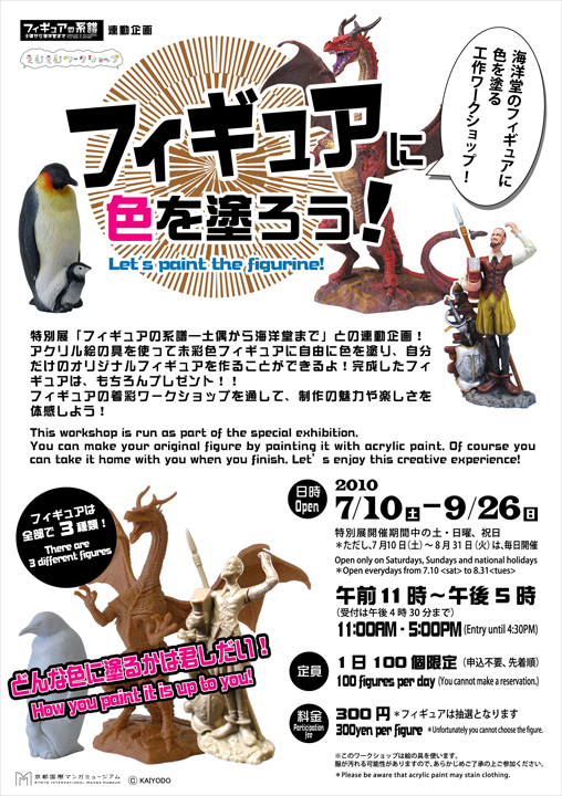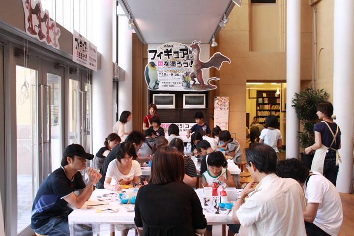 特別展「フィギュアの系譜―土偶から海洋堂まで」との連動企画。アクリル絵の具を使って未彩色フィギュアに自由に色を塗り、自分だけのオリジナルフィギュアを作ることができる。フィギュアの着彩ワークショップを通して、制作の魅力や楽しさを体感する事を目的として開催した。体験では、3種類の未彩色フィギュア(ドラゴン・ペンギン・ドンキホーテ)が入っている箱から抽選で1つ選択し、自由に色を塗ってもらう。個々用の塗りかた説明書やその英語版の準備の他、床に保護シートを敷くなど、前回のノウハウや反省点を活かすことができた。その甲斐あってか、海外の方にも多くご参加いただくことができ、参加者の満足度向上にも繋げることができた。
