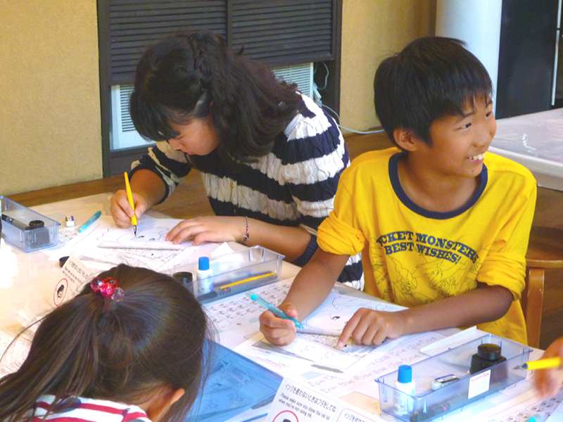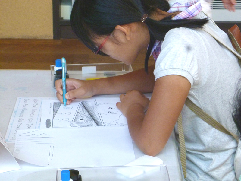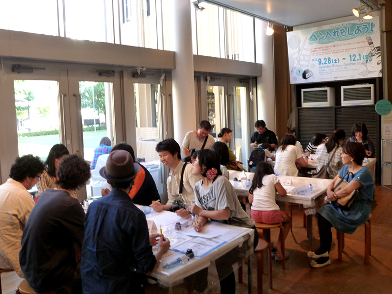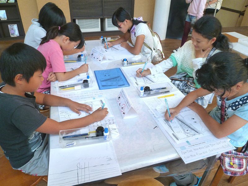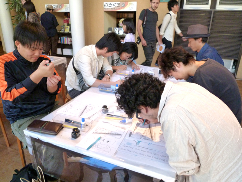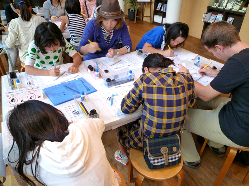 スタッフによる画材のレクチャーと練習の後に、本番のペン入れをしてもらった。