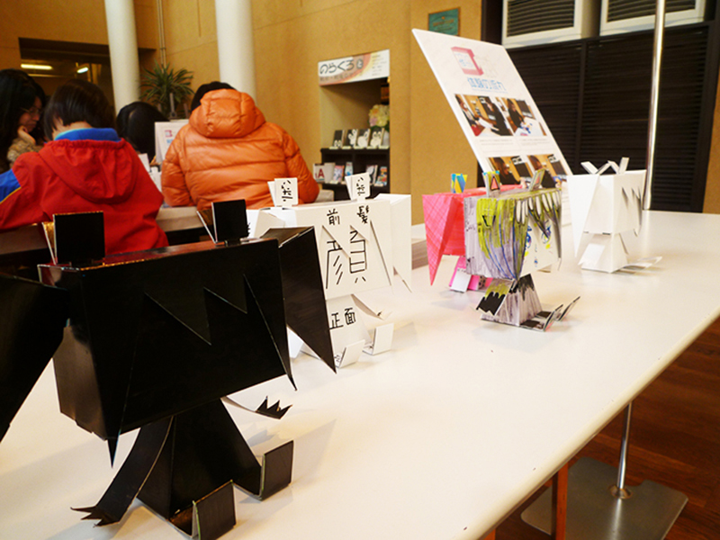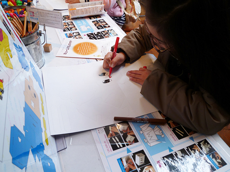 こちらでは、「組み上がった時にどうなるのか」ということを想像してもらうための「展開図見本」と、折り方やパーツを間違えないようにするための「作り方シート」を作成した。(制作物参照)
